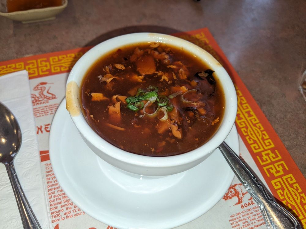 Soup that is both spicy and sour, typically flavored with hot pepper and vinegar. Spicy.
